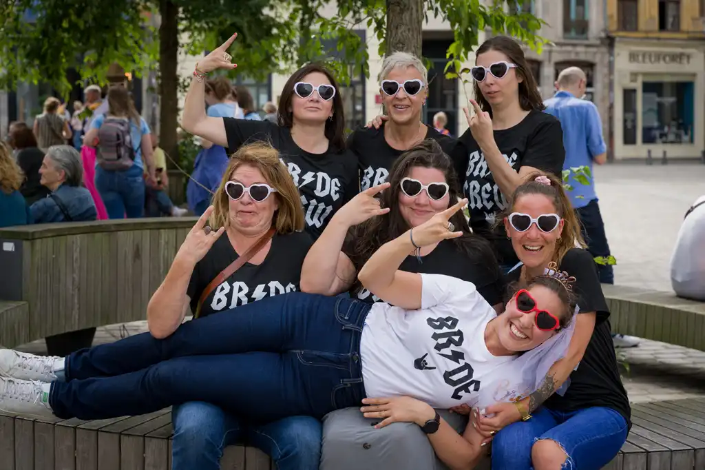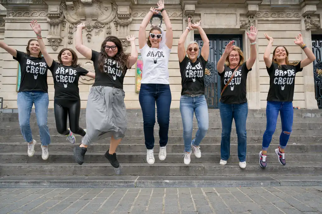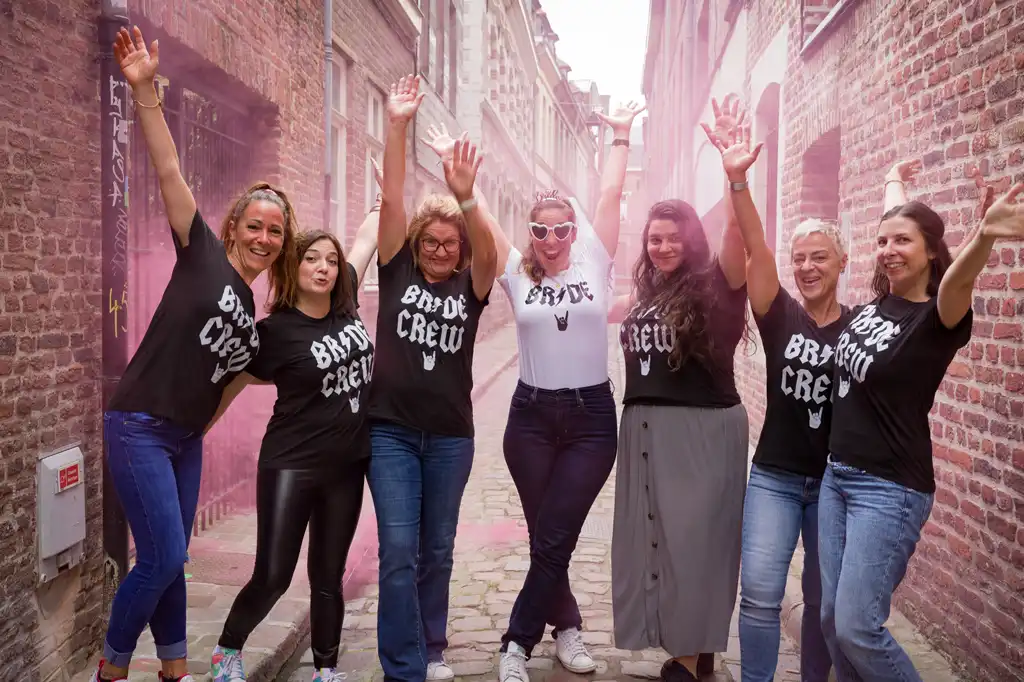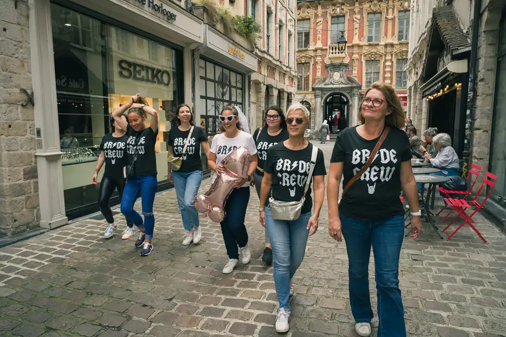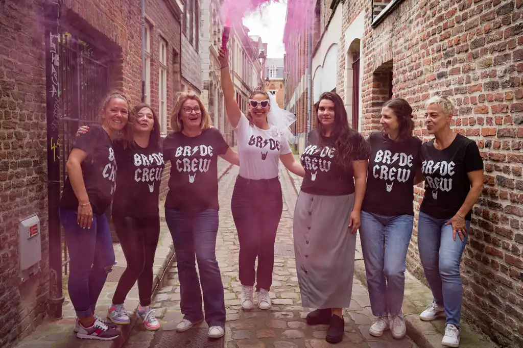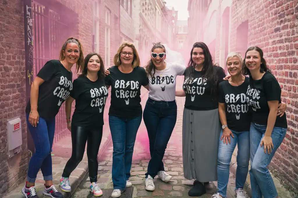 Retour sur un shooting EVJF Vieux-Lille haut en couleur avec Maud et sa Bird Team ! Pour célébrer son enterrement de vie de jeune fille, les filles avaient choisi un look coordonné : tee-shirts noirs “Bird Team” et jean pour toutes, sauf Maud qui portait fièrement la version blanche, symbole de la future mariée. L’ambiance ? Un mélange explosif de rires, de complicité et de rock attitude.
