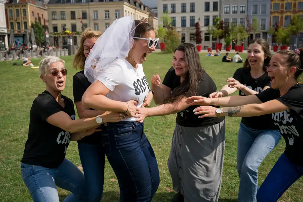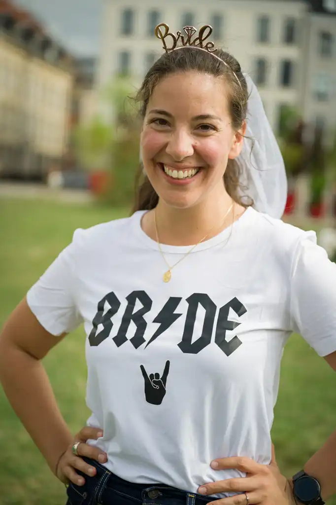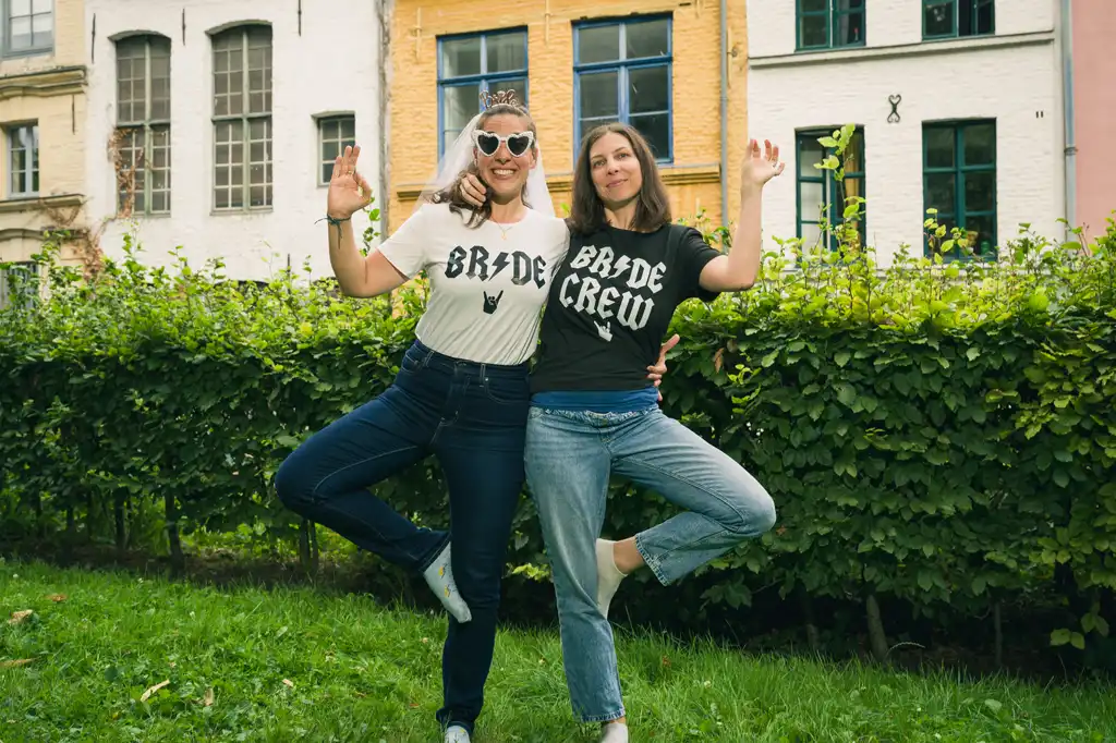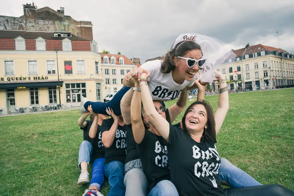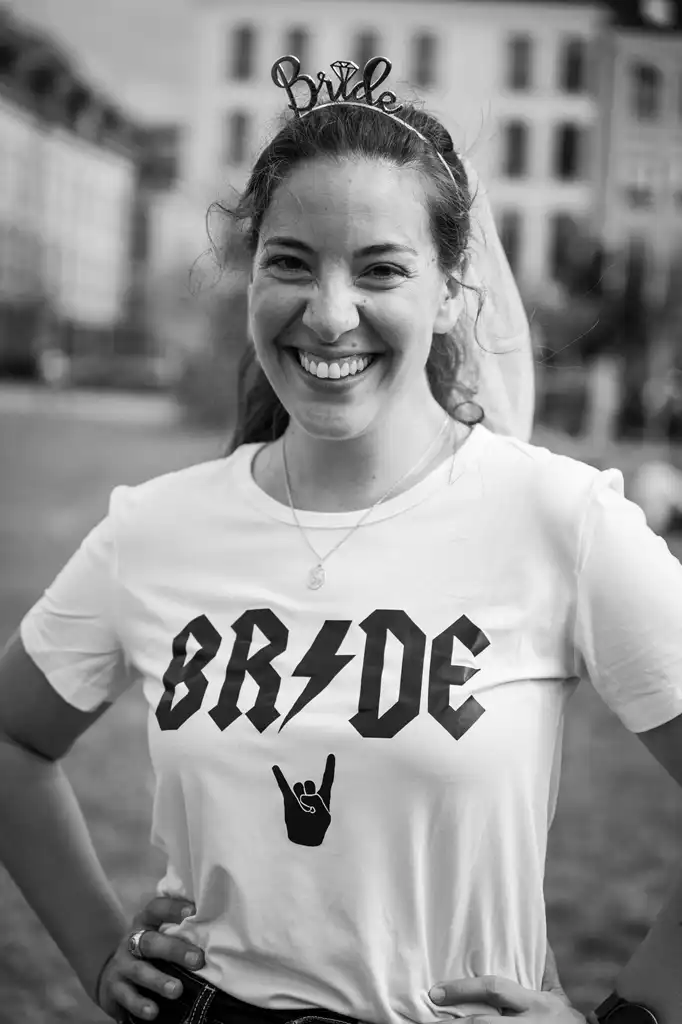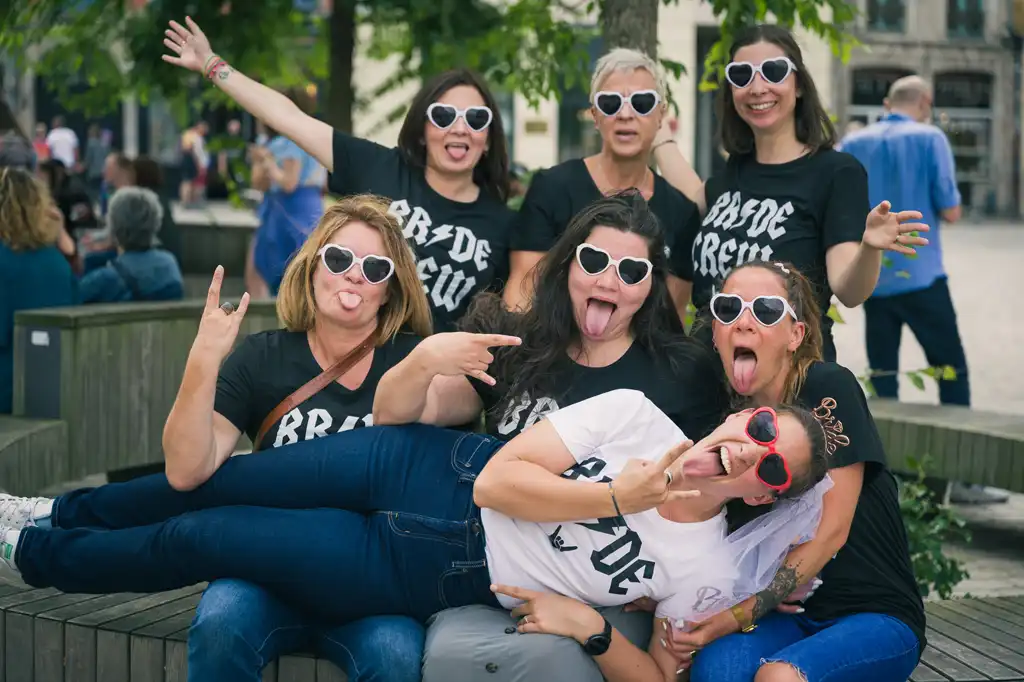 Retour sur un shooting EVJF Vieux-Lille haut en couleur avec Maud et sa Bird Team ! Pour célébrer son enterrement de vie de jeune fille, les filles avaient choisi un look coordonné : tee-shirts noirs “Bird Team” et jean pour toutes, sauf Maud qui portait fièrement la version blanche, symbole de la future mariée. L’ambiance ? Un mélange explosif de rires, de complicité et de rock attitude.